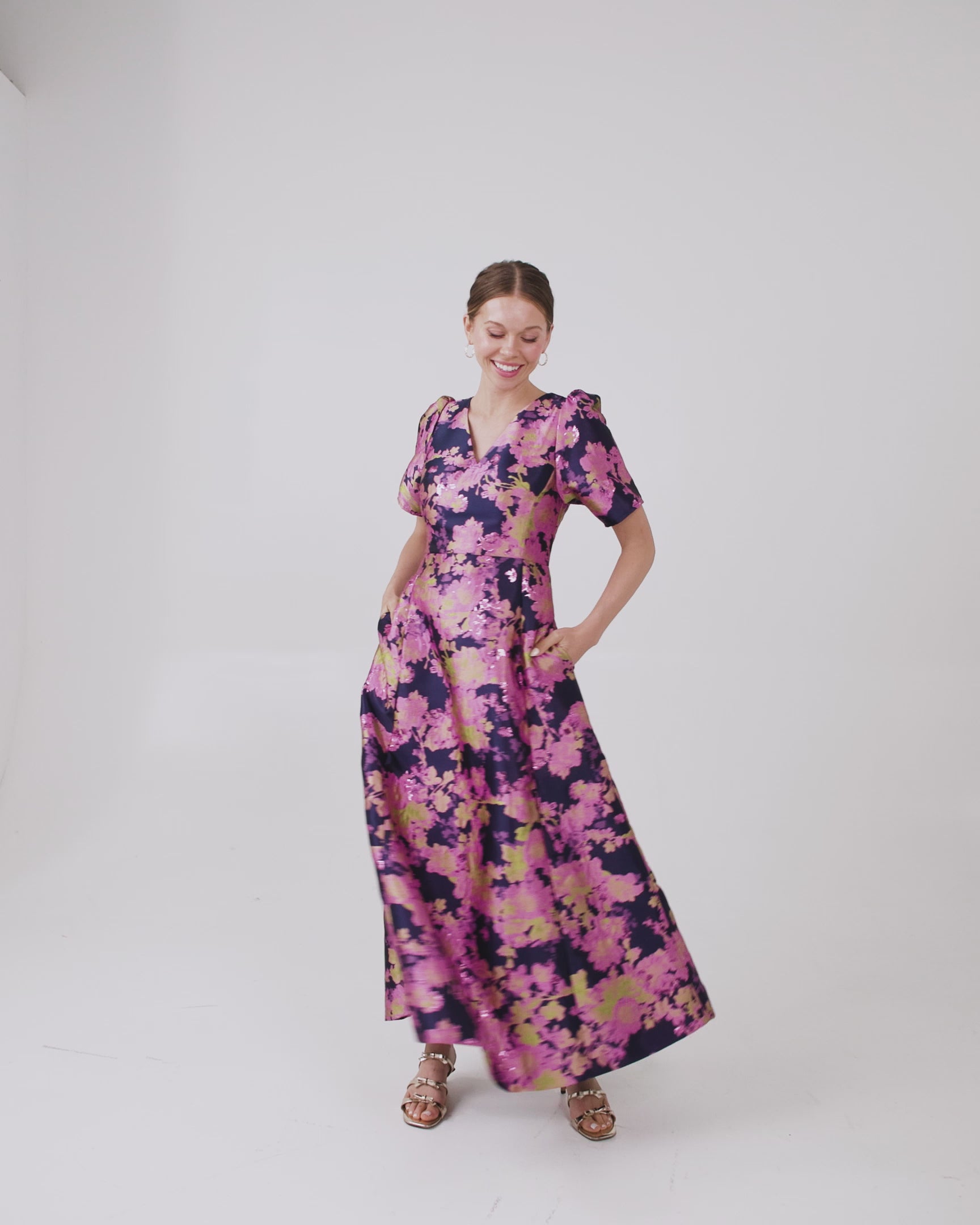 The Arden Gown in Navy Abstract Brocade showcases a dramatic, sculptural floral pattern in rich navy and shimmering metallic tones. Its elegant short sleeves and flattering V-neckline pair beautifully with the voluminous full-length skirt, creating a look of modern sophistication. Perfect for black-tie weddings, mother-of-the-bride moments, and formal soirées, this gown’s lustrous fabric and timeless silhouette make it an unforgettable choice.