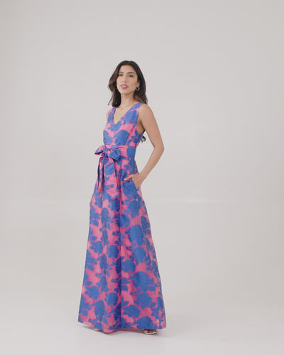 The Arden Gown in pink organza features bold blue rose florals and a flattering sleeveless V-neck silhouette. With its full, flowing skirt, this elegant full-length gown is perfect for weddings, mother-of-the-bride moments, and special occasions. Lightweight and striking, it blends timeless grace with a vivid floral statement.