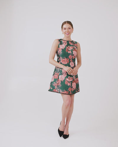 The Avery Dress in Forest Mum jacquard features deep, earthy tones with pops of pink florals. Its flattering A-line silhouette and classic crew neckline are finished with a detailed trim for subtle glam. Sleeveless and textured, it’s perfect for brunch, daytime events, or cocktail hour.
