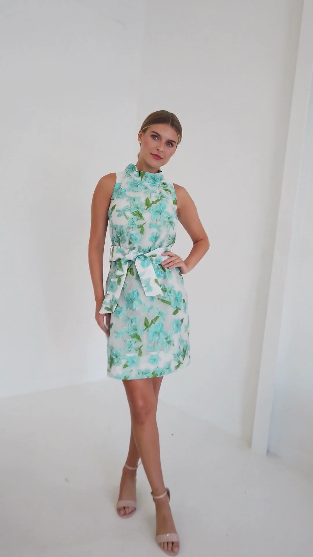 The Betty is our best-selling sleeveless shift dress with a playful ruffle collar and removable belt. This crisp organza piece features a tropical-inspired floral design in turquoise and blue that is perfect for your spring events. This dress is so easy and comfortable to throw on for a special event, you'll want one in every color.