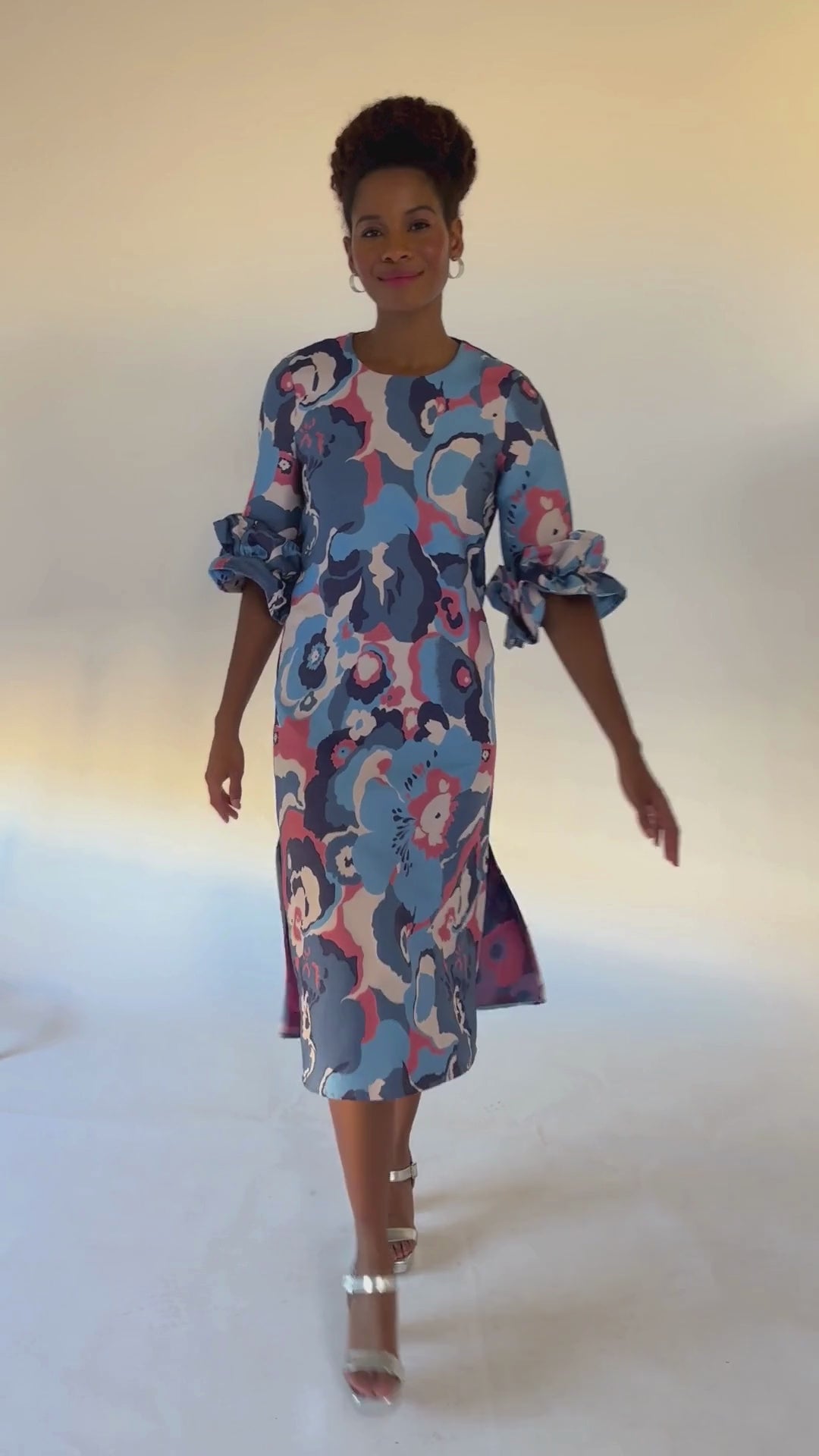 Bold, feminine, and effortlessly chic, the Bronwyn Dress is the moment for any fun-filled event. Crafted from blue retro floral jacquard, its straight shift silhouette is elevated with playful ruffled cuffs for a statement touch. Perfect for a cocktail party or festive soirée, style it with vibrant heels and dazzling earrings to turn heads all night.