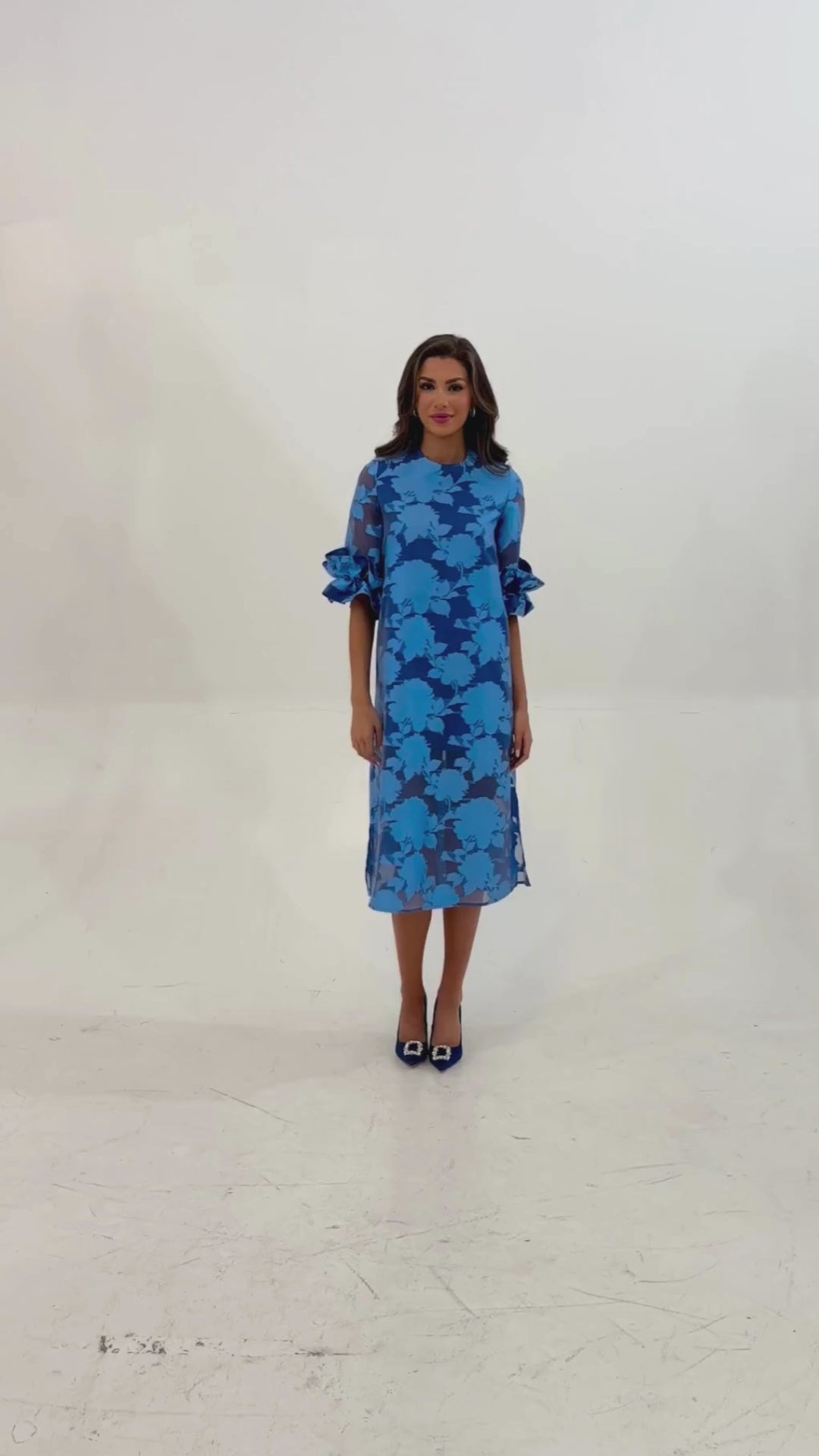 The Bronwyn Dress features a straight shift silhouette that exudes effortless elegance. Crafted in airy blue tea rose organza, it’s detailed with sheer ruffled sleeves for a delicate, artful touch. Perfect for weddings, luncheons, and formal occasions year-round, this refined style pairs beautifully with heels and statement earrings for an elevated look.