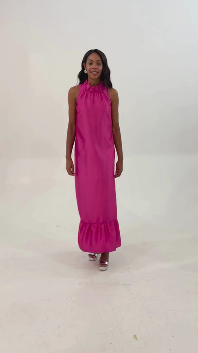 The Camille Gown in hot pink dupioni is a stunning statement for the season. Its elegant column silhouette and softly gathered ruffle neckline combine timeless sophistication with subtle texture and depth. With a luxe fabric that catches the light beautifully, this gown is perfect for weddings and special occasions when you want to feel effortlessly graceful and uniquely polished.