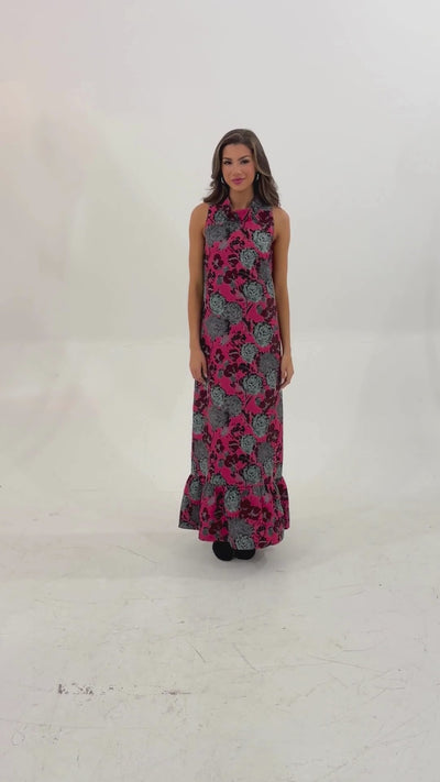 Its elegant column silhouette and softly gathered ruffle neckline combine timeless sophistication with subtle texture and depth. Crafted in bold hot pink vintage dahlia jacquard, the gown features a matching ruffle along the hem for graceful movement. Sleek and structured, it flatters the figure while making a statement at gala evenings, fall weddings, or any occasion that calls for unforgettable style. Pair with the Marisol Coat or bold accessories for a fully polished look.