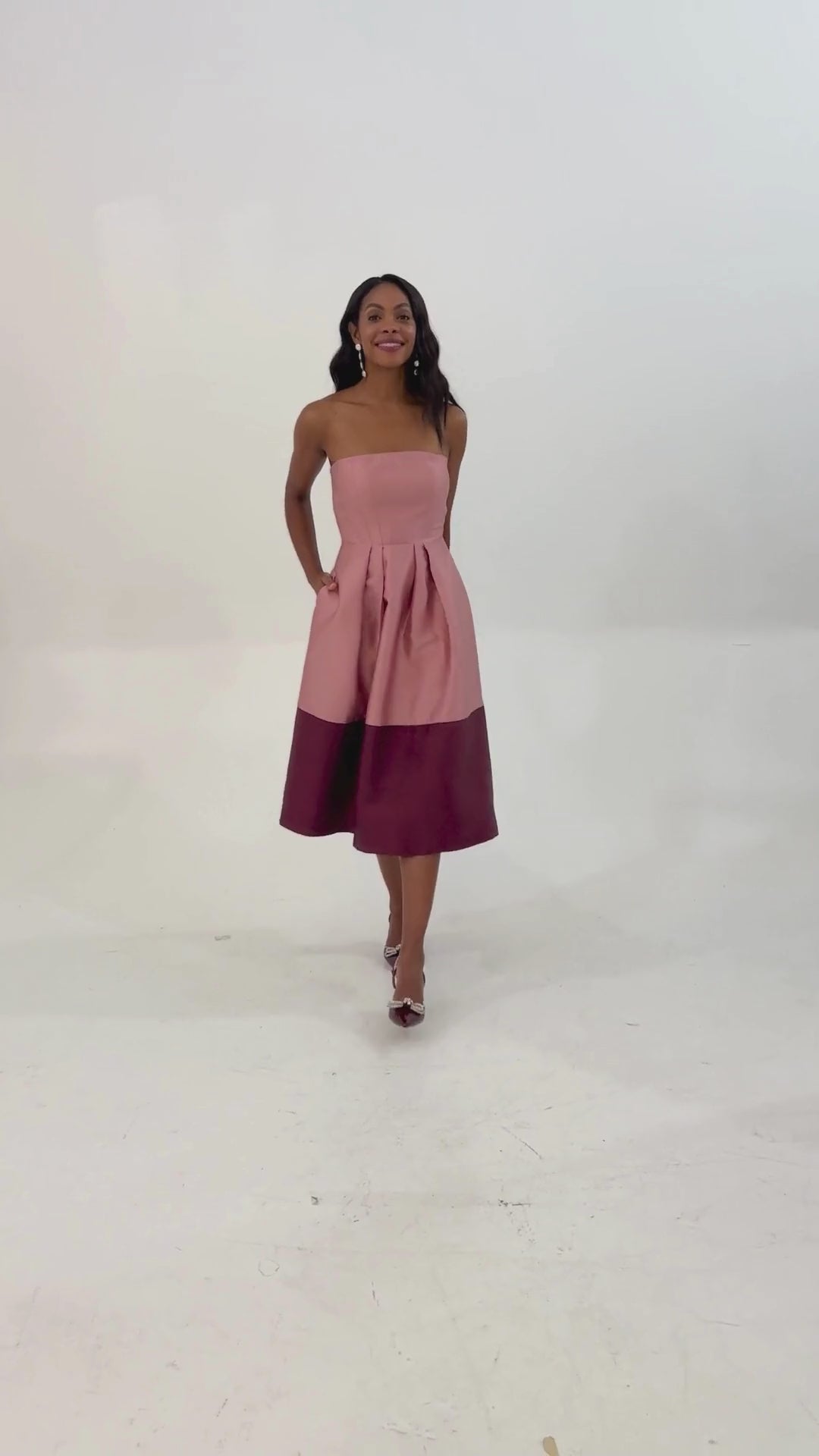Modern and sophisticated, the Catherine Dress features a strapless, fit-and-flare silhouette crafted from luxe blush pink mikado. A bold cranberry color block at the skirt adds a striking, contemporary edge, while the pleated waistline ensures a flattering, feminine shape. Bodice boning and precise seaming provide structure and polish, making this gown perfect for cocktail weddings, evening events, and formal occasions where you want to stand out with effortless elegance.