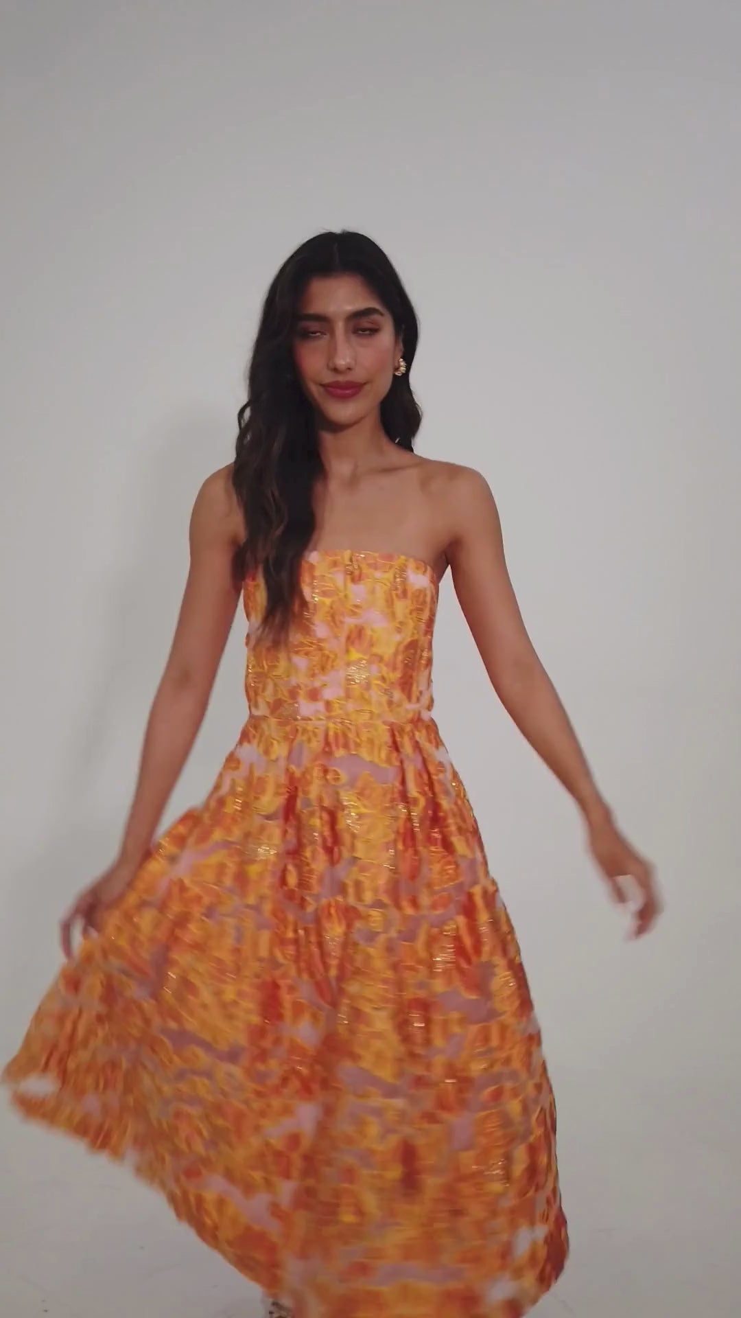 Striking and romantic, this tea-length number is the perfect dress for all your RSVP’s. Featuring a striking strapless neckline, complete with bodice boning and flattering seaming, this dress is crafted in a bold floral organza fit for royalty. Stash your favorite lipstick in the conveniently placed in-seam pockets and pair it with a statement necklace or earring. You’ll be the best-dressed anywhere, guaranteed!