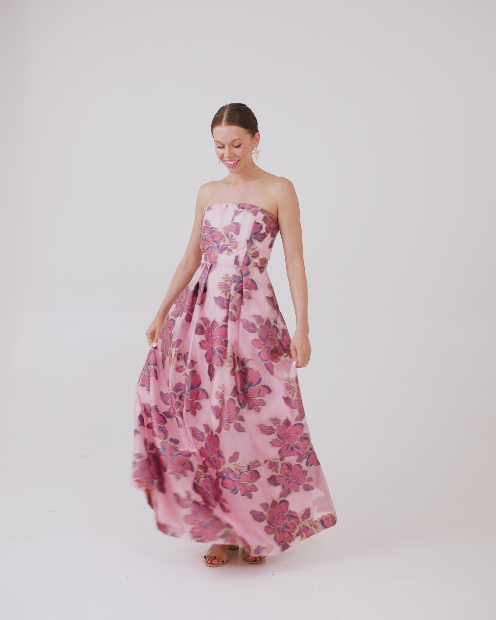 A full-length evolution of our beloved Catherine Dress, this gown brings timeless romance to every special occasion. Crafted in delicate pink peony organza, it features a strapless, fit-and-flare silhouette with a pleated waistline that flatters the figure. Bodice boning and precise seaming ensure a polished, structured fit, while the flowing skirt moves gracefully with every step. Perfect for weddings, galas, or any formal affair.