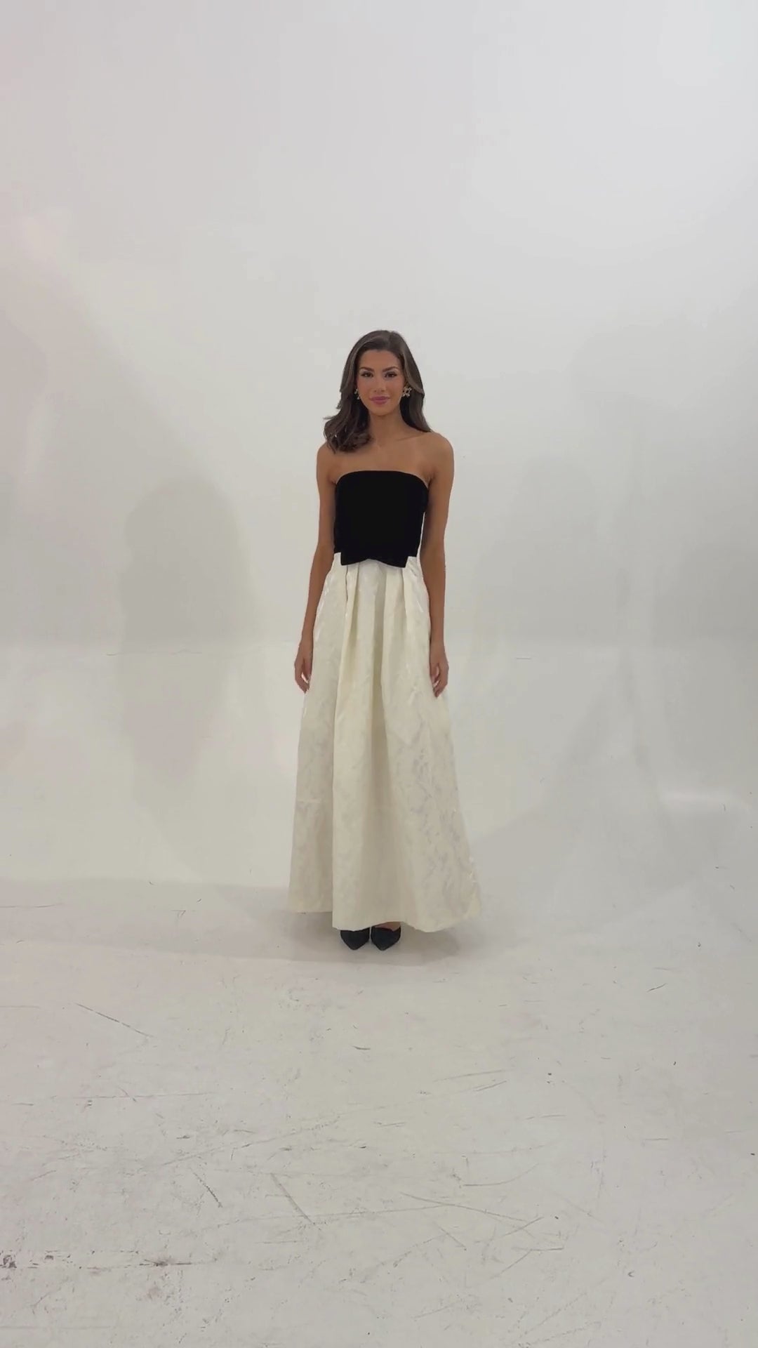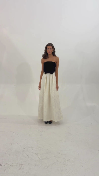 A winter wonder of timeless elegance, the Catherine Gown in black velvet and ivory embossed satin is a regal statement for any formal occasion. This full-length, strapless gown features a fit-and-flare silhouette with a pleated waistline that flatters the figure, while bodice boning and precise seaming create a polished, structured fit. The flowing skirt moves gracefully with every step, making it perfect for galas, weddings, or holiday soirées.
