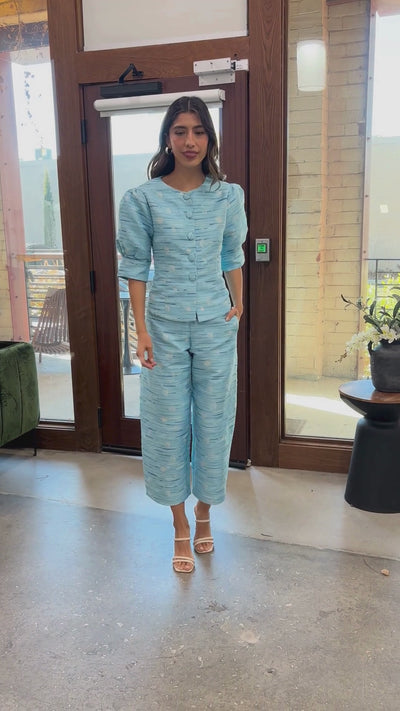 Soft structure meets effortless style in the Cleo Top. Crafted in light blue textured dupioni, this polished silhouette features quarter-length puff sleeves with cuffs, a covered button-up front, and a clean, rounded neckline for a refined finish. Pair it with the matching Taylor Pant for a chic, coordinated set, or style it on its own for an elevated everyday look. Perfect for spring days when you want to look put-together without trying too hard.
