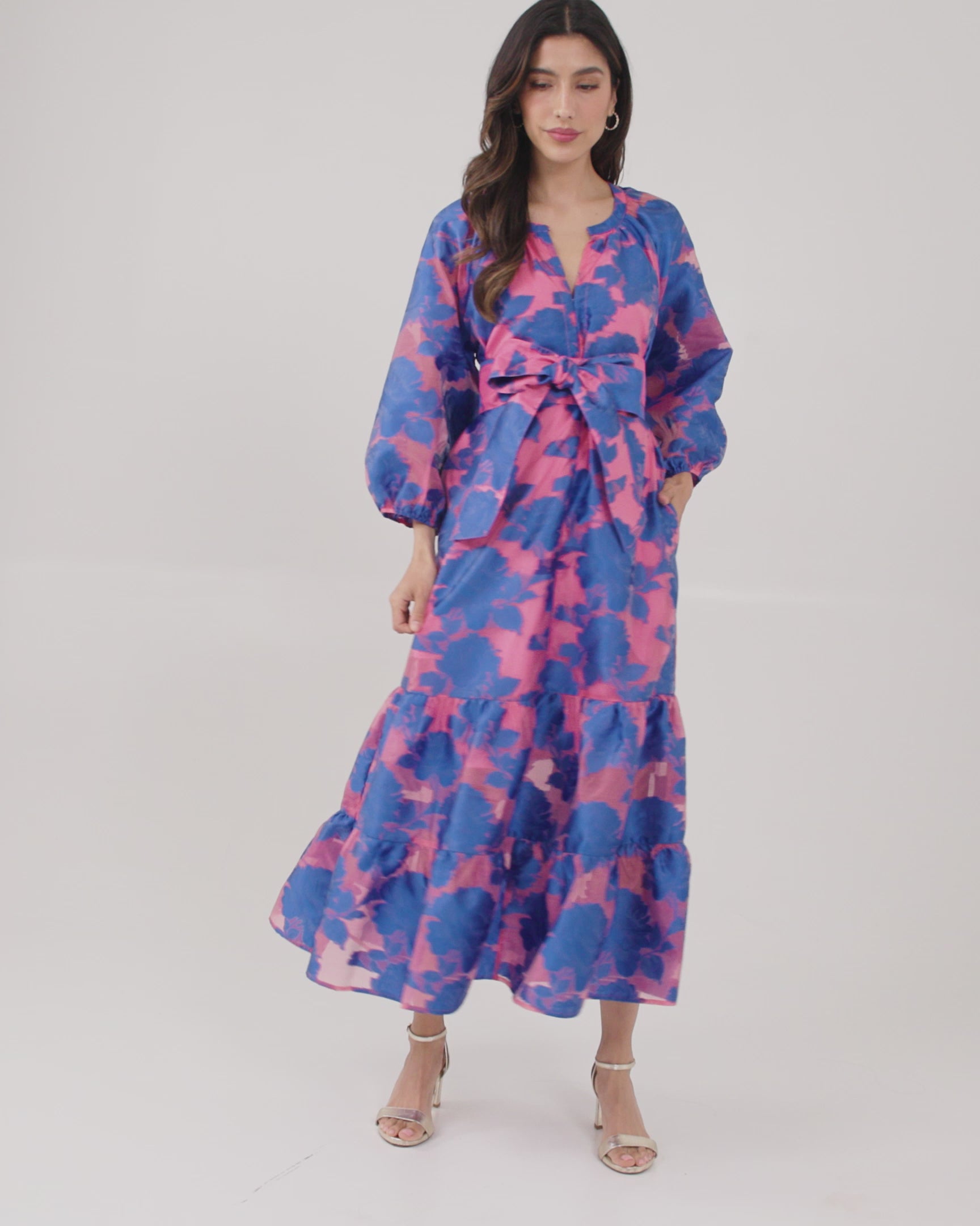 The Elise Dress is a striking maxi layered in pink organza adorned with bold blue roses. Featuring a tiered skirt, flattering V-neck, and a removable self-belt sash, this airy dress is both elegant and effortless. Perfect for brunch or evening events—style it with heels and statement earrings, or keep it casual with flats and a bag.