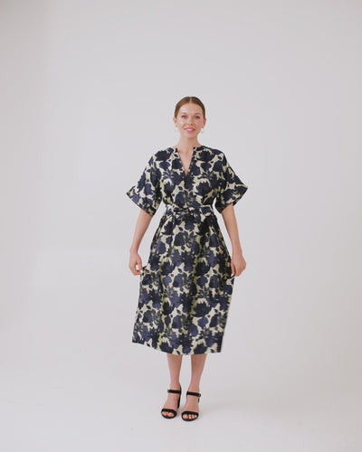 Effortless and refined, the Evelyn Dress offers a modern take on classic elegance. This V-neck midi silhouette features short, kimono-inspired sleeves and a self-tie belt that defines the waist for a flattering, feminine shape. Cut in ivory and navy floral silhouette jacquard, the fabric’s soft sheen and sculptural pattern add depth and sophistication. Perfect for luncheons, weddings, or evening events, the Evelyn transitions seamlessly from day to night with timeless style.