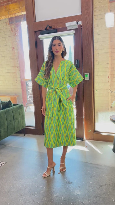 Effortless and refined, the Evelyn Dress offers a modern take on classic elegance. This V-neck midi silhouette features short, kimono-inspired sleeves and a self-tie belt that defines the waist for a flattering, feminine shape. Crafted in our bold Lime Ikat Jacquard, the textured fabric and vibrant pattern bring fresh dimension and statement appeal. The Evelyn transitions seamlessly from day to night with confident, polished style.