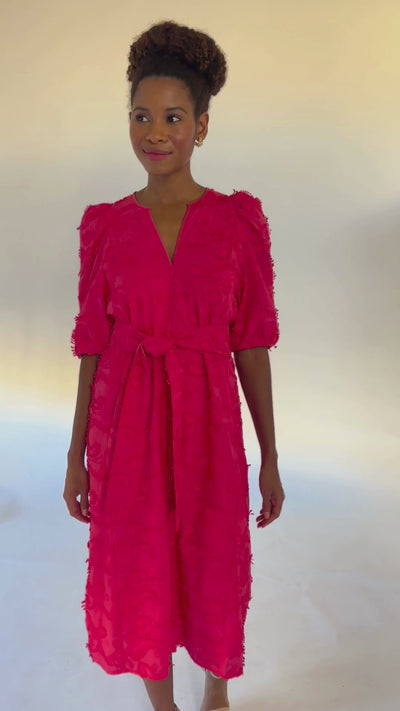The Florence Dress is your warm-weather standout. Crafted in breathable Hot Coral 3D Paisley cotton, this midi-length silhouette features a flattering neckline, easy short sleeves, and a self-tie belt to cinch the waist just the way you like. Light, effortless, and full of texture, it’s perfect for sunny days, weekend plans, and everything in between—just add sandals and go.