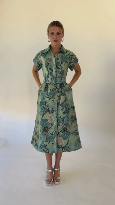 Crafted in luxurious sage mum floral jacquard, the Harper Dress features a collared neckline, half-button front, belted waist, and short sleeves for a flattering, versatile silhouette. Perfect for dressy daytime events or spring evenings, this midi dress can be styled with flats for a relaxed look or heels for a more refined ensemble. Its timeless design makes it an effortless choice for transitioning from winter to spring.