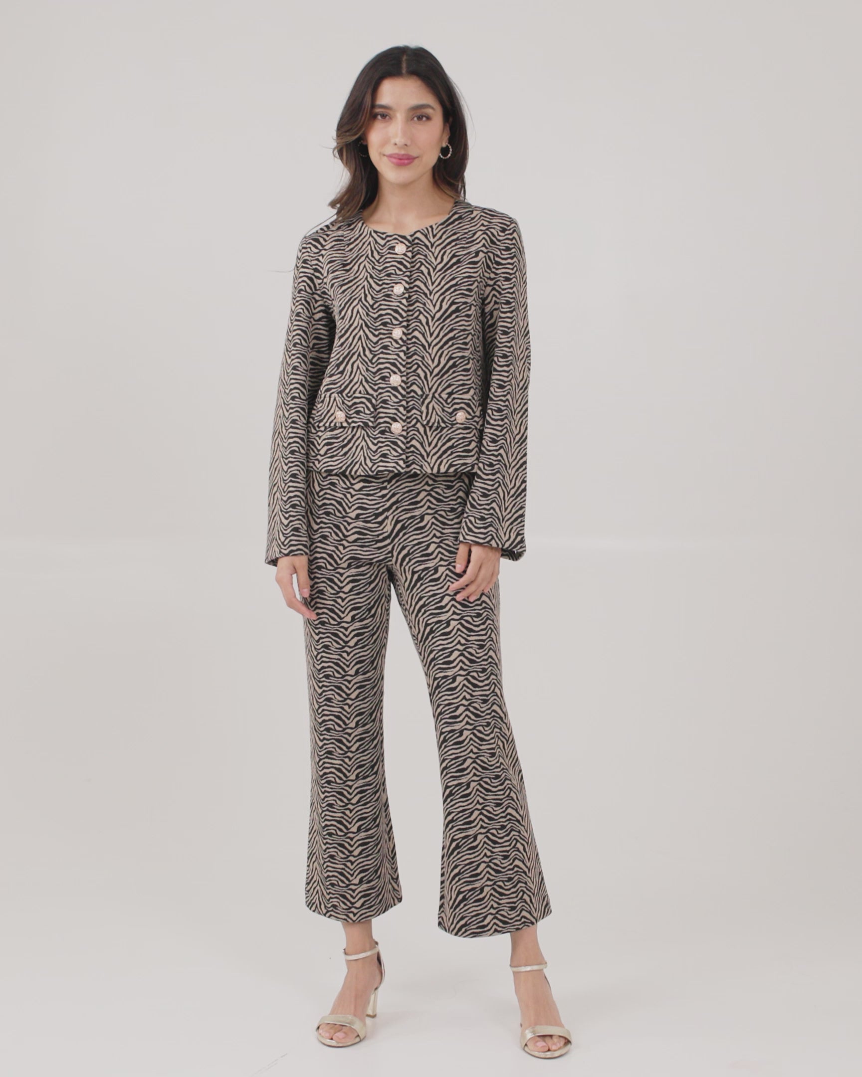 The Kennedy Jacket in Taupe Stretch Jacquard is fall chic with its sleek tan and black zebra print. Crafted from comfortable stretch jacquard, it features covered buttons and a clean, slightly cropped silhouette. Pair it with the coordinating Blake pant for a polished set—perfect for autumn events, parties, or effortless day-to-night style.
