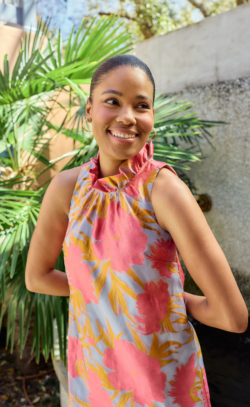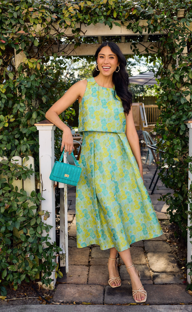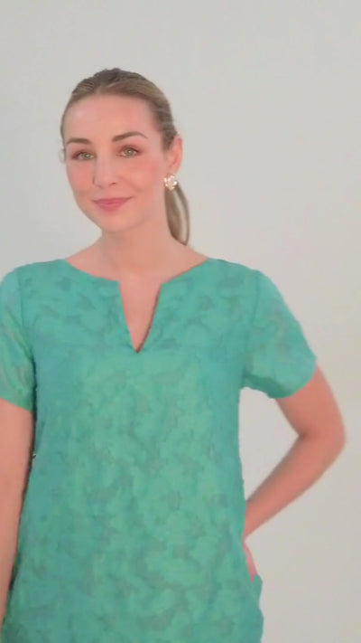 The Lulu Dress is your perfect go-to dress, combining timeless style with a modern twist. Crafted in turquoise cloud organza, this classic shift dress features a dramatic V-neckline and in-seam pockets for both elegance and practicality. The mod-inspired silhouette is versatile enough to pair with flats for a daytime luncheon or transition to heels and statement earrings for an evening cocktail hour.