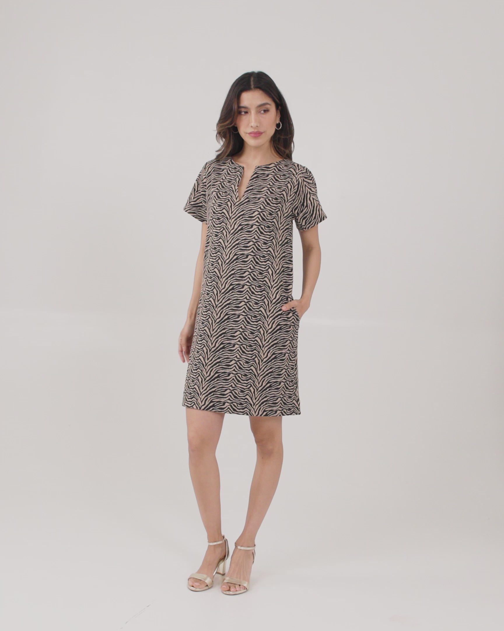 The Lulu Dress in Taupe Stretch Zebra Jacquard is your perfect go-to dress, blending timeless style with a modern edge. Crafted from comfortable stretch jacquard in a chic tan and black zebra print, this classic shift dress features a dramatic V-neckline and in-seam pockets for both elegance and practicality. Its mod-inspired silhouette transitions effortlessly from daytime events with flats to evening cocktails with heels and statement earrings.