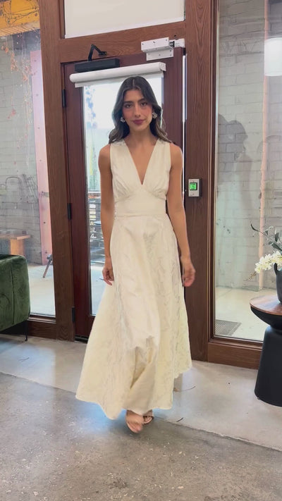 A modern bridal statement, the Martha Gown is crafted in luminous ivory garden-embossed satin with a soft, dimensional finish. This sleeveless A-line silhouette features a flattering V-neckline and graceful movement, creating an effortlessly elegant look from every angle. Timeless and refined, it’s perfect for bridal moments, rehearsal dinners, courthouse ceremonies, and celebrations that call for something truly special.