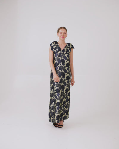 Effortless elegance defines the Meredith Gown. Cut in a sleeveless, full-length shift silhouette, this style features a flattering V-neckline and a dramatic bow shoulder detail for a touch of playful sophistication. Crafted in an ivory and navy floral silhouette jacquard, the fabric’s subtle sheen and dimensional pattern bring modern artistry to a timeless shape. Designed to slip on with ease, it’s the perfect gown for weddings, galas, and milestone moments.