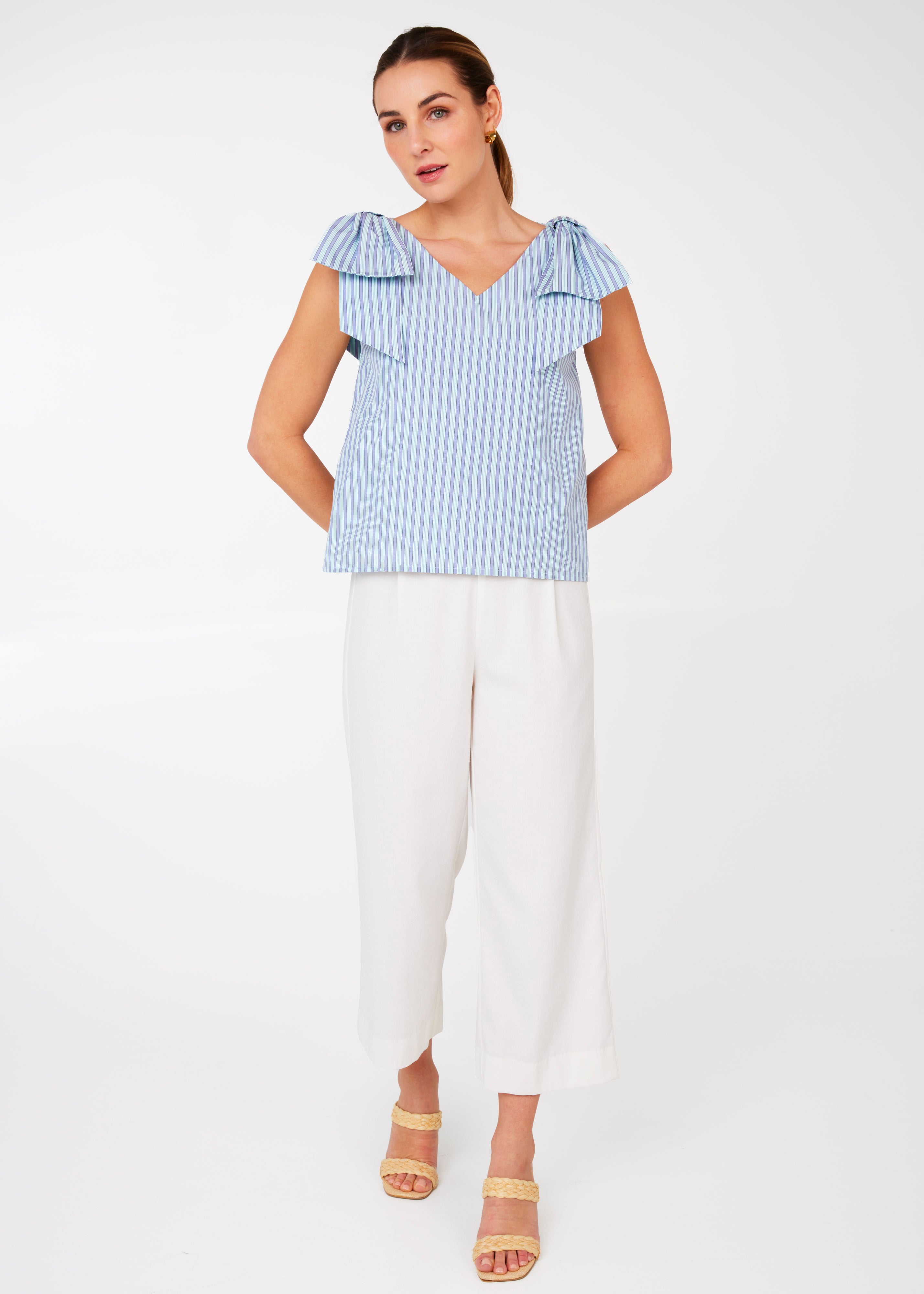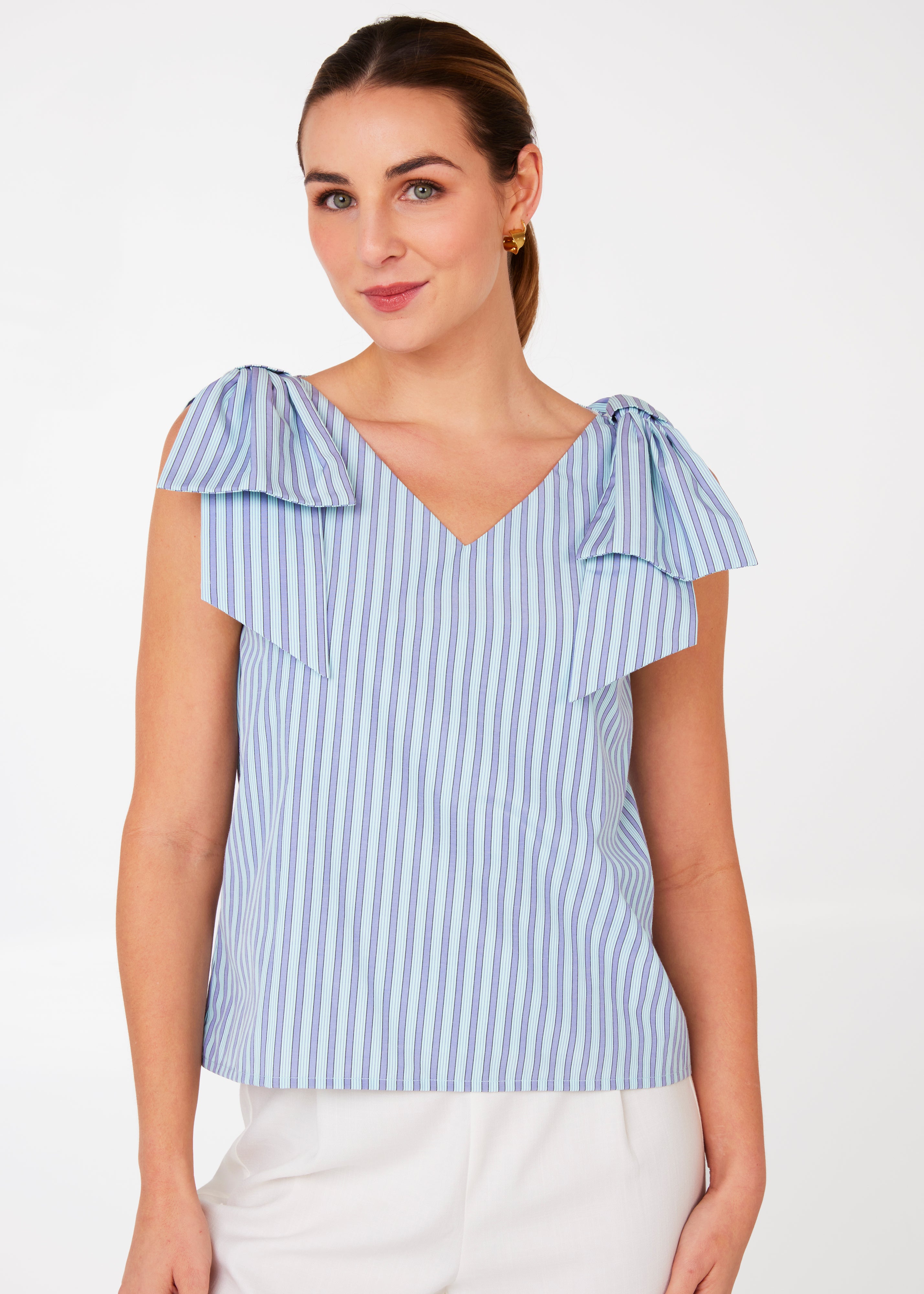 The Meredith Top is an elevated tank style that combines comfort and class with a playful statement bow shoulder detail. Perfect for the summer season, this versatile top can be paired with a pattern for a bold look or styled with solid pants for a clean, fresh look.