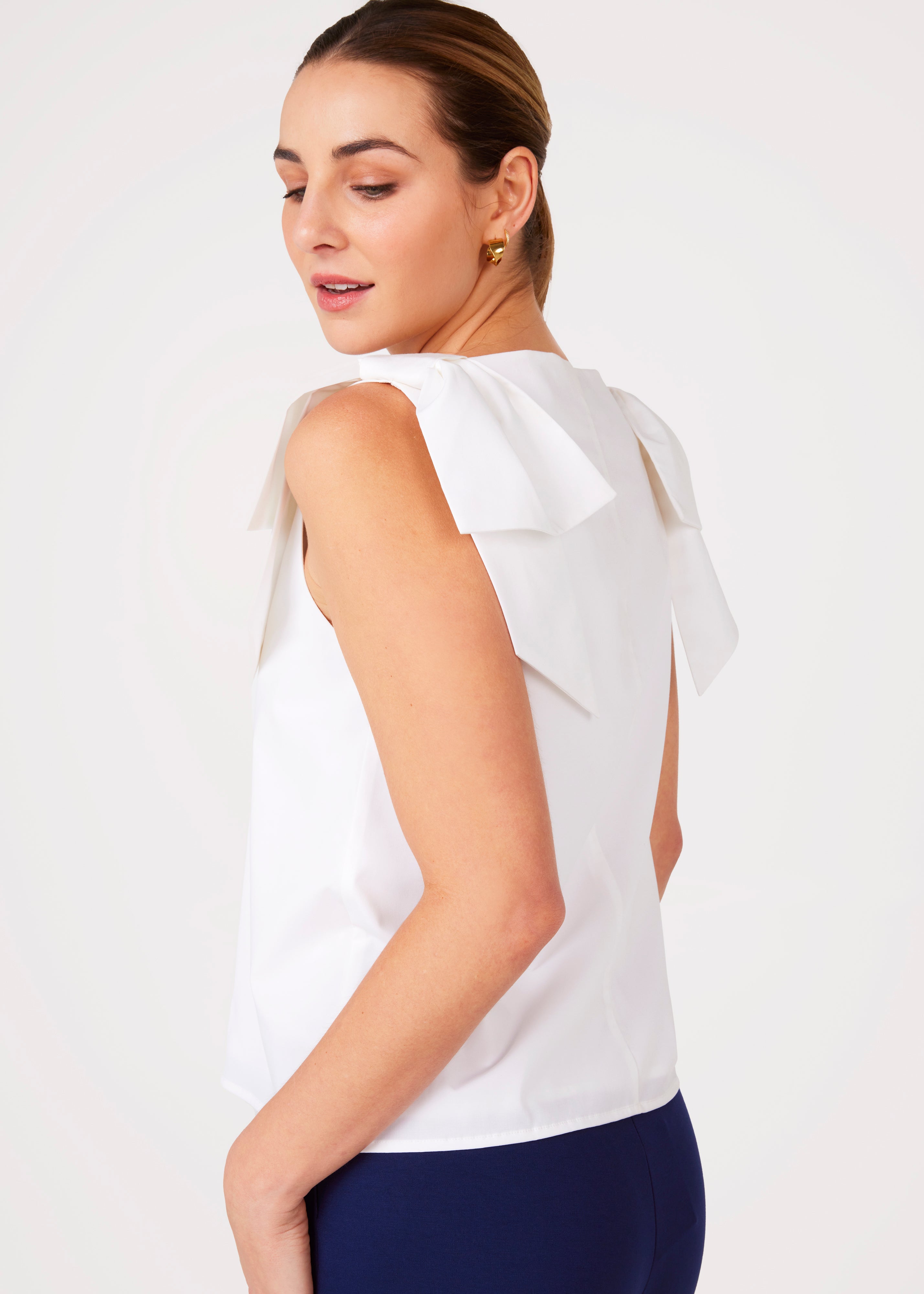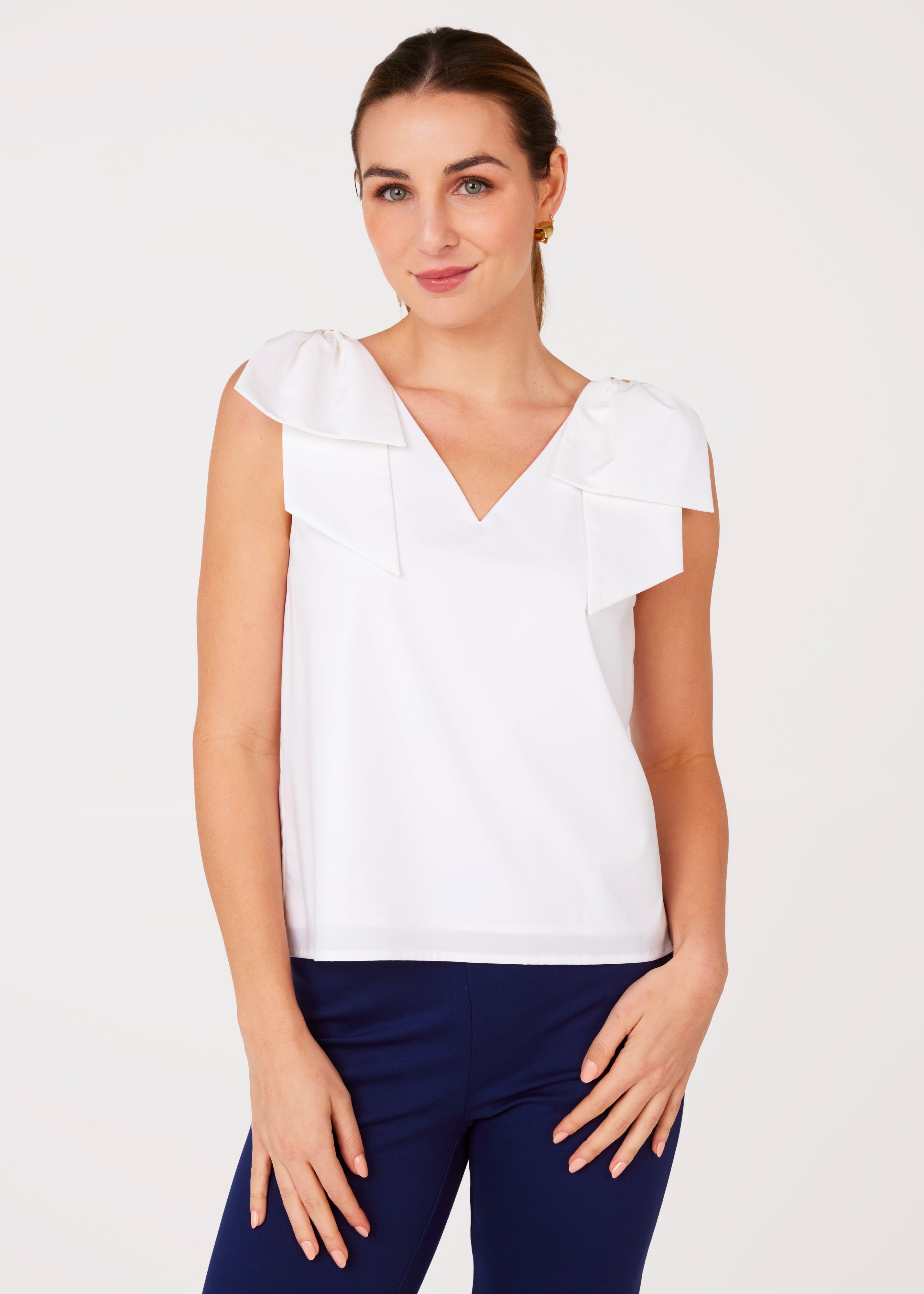 The Meredith Top is an elevated tank style that combines comfort and class with a playful statement bow shoulder detail. Perfect for the summer season, this versatile top can be paired with a pattern for a bold look or styled with solid pant for a clean, fresh look.