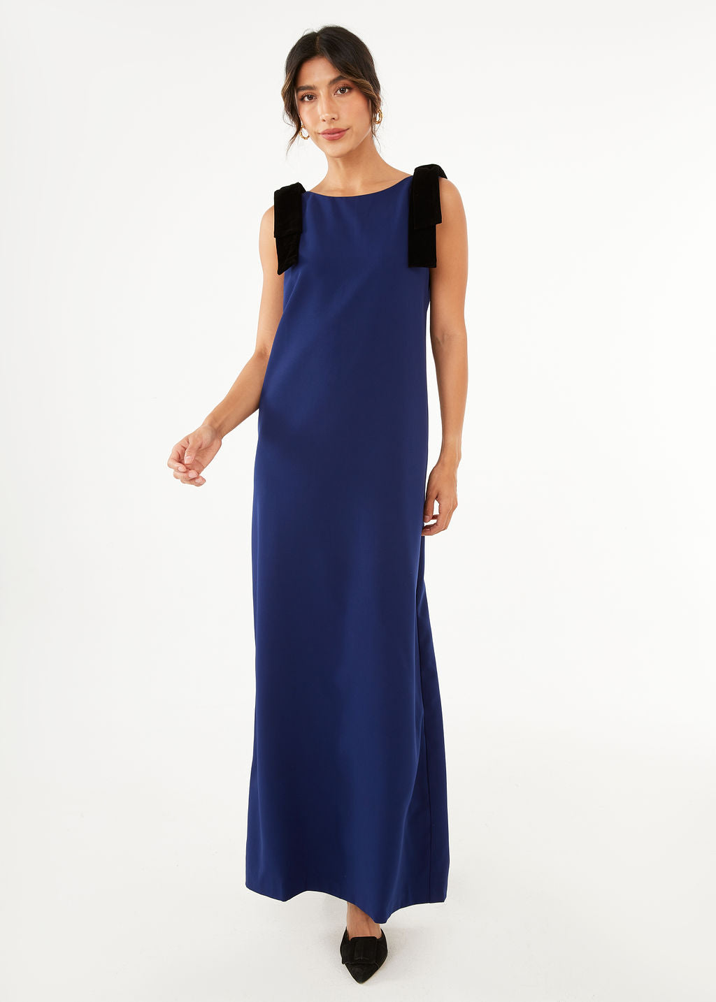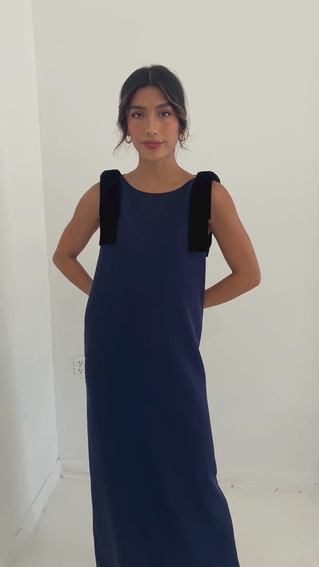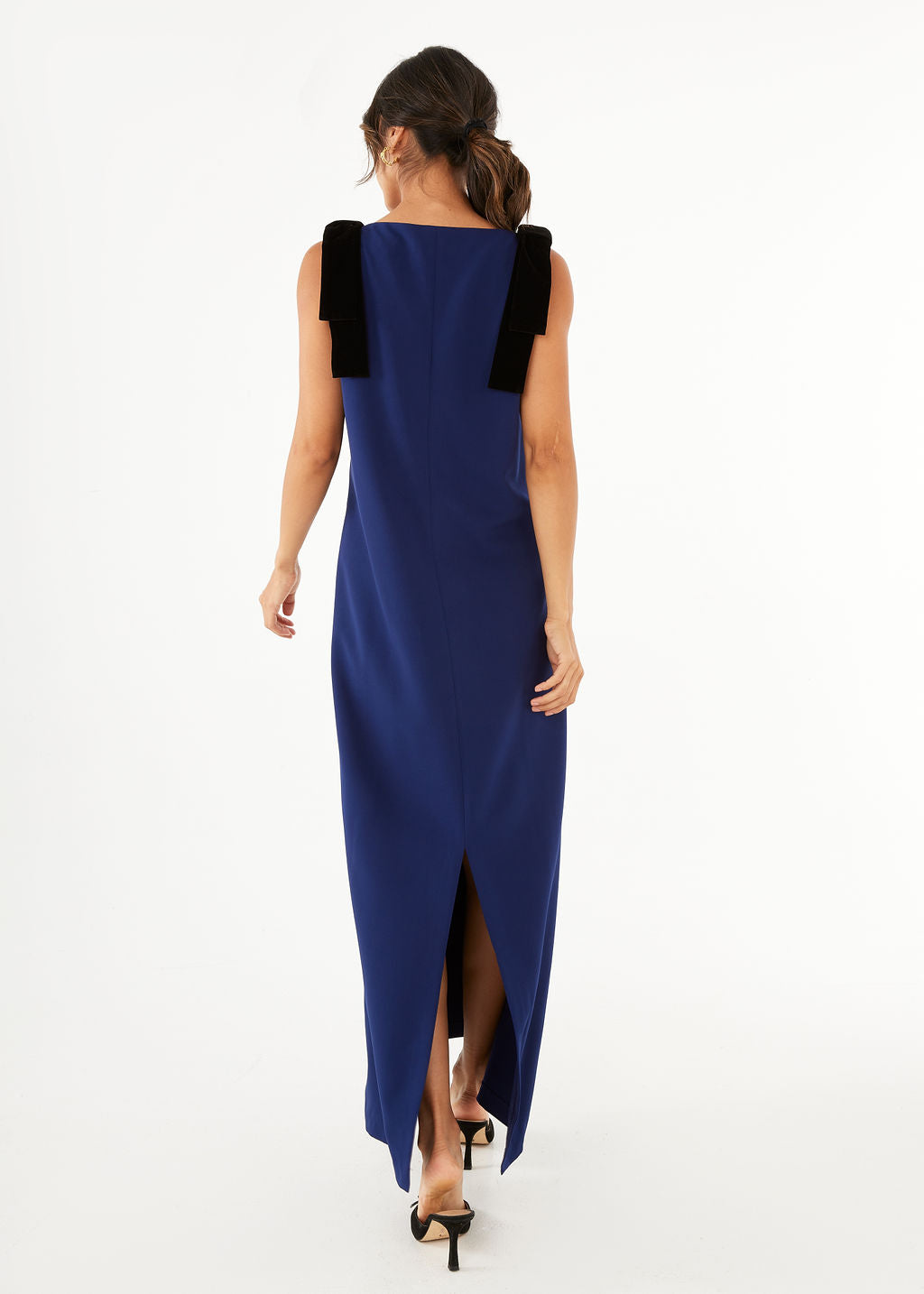 This vintage-inspired shift dress is a showstopper for your next gala or wedding. Crafted from rich navy crepe, it features luxe black velvet bows at the shoulders, adding an elegant touch to the playful silhouette. The Michelle dress is ready to wear and promises to be your go-to gown for special occasions, season after season.