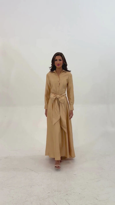 Turn heads this season in the Olivia Skirt, crafted from luxurious gold dupioni with a subtle lustrous finish. This full-length skirt features a slight high-low hem and an oversized sash belt that ties at the waist, creating a dramatic yet elegant silhouette. Perfect for festive occasions, pair it with the Nora Blouse for a holiday hostess-worthy look or the Zara Tank Top for modern, show-stopping glamour.