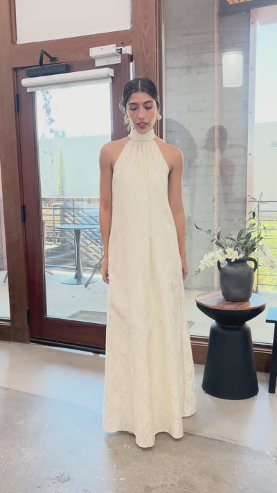 The Rory Gown introduces a fresh, elegant silhouette in soft ivory embossed satin. Featuring a high neckline with delicate beaded trim and a versatile bow-tie that can be worn at the neck or back, this full-length gown flows effortlessly from the shoulders for a relaxed, ethereal shape. Lightweight and drapey, the Rory Gown is perfect for bridal occasions where effortless, flowing elegance takes center stage.