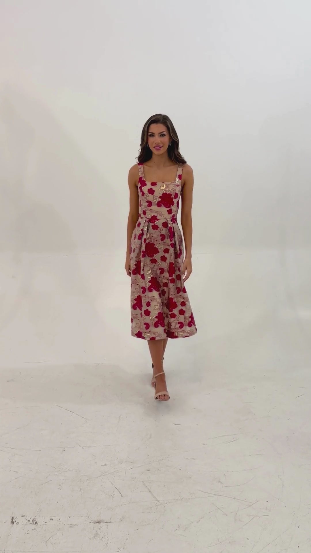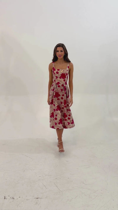 This organza party dress is perfect for holiday celebrations and formal events this season! With a flattering fit-and-flare shape, a rounded square neckline, and a gathered waist, the Victoria Dress blends style and sophistication. Crafted in an intricate floral organza with a touch of metallic, this dress pairs perfectly with statement heels and elegant accessories.