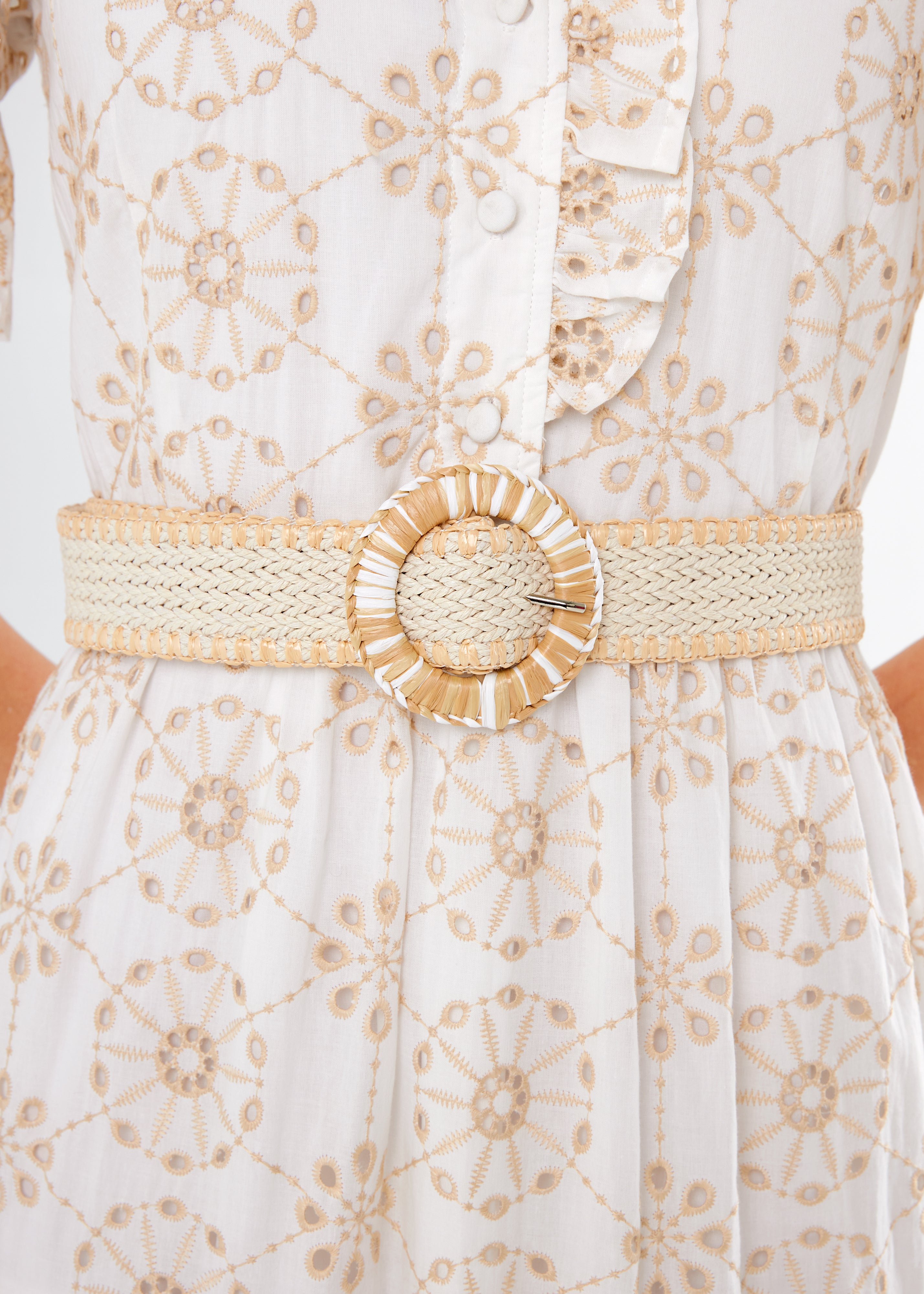 Complete your look with our Woven Raffia Belt, a chic accessory that adds texture and effortless elegance to any outfit. Designed with intricate woven detailing and a beautifully crafted round buckle, this belt is the perfect finishing touch for breezy dresses, tailored separates, and relaxed resort wear.