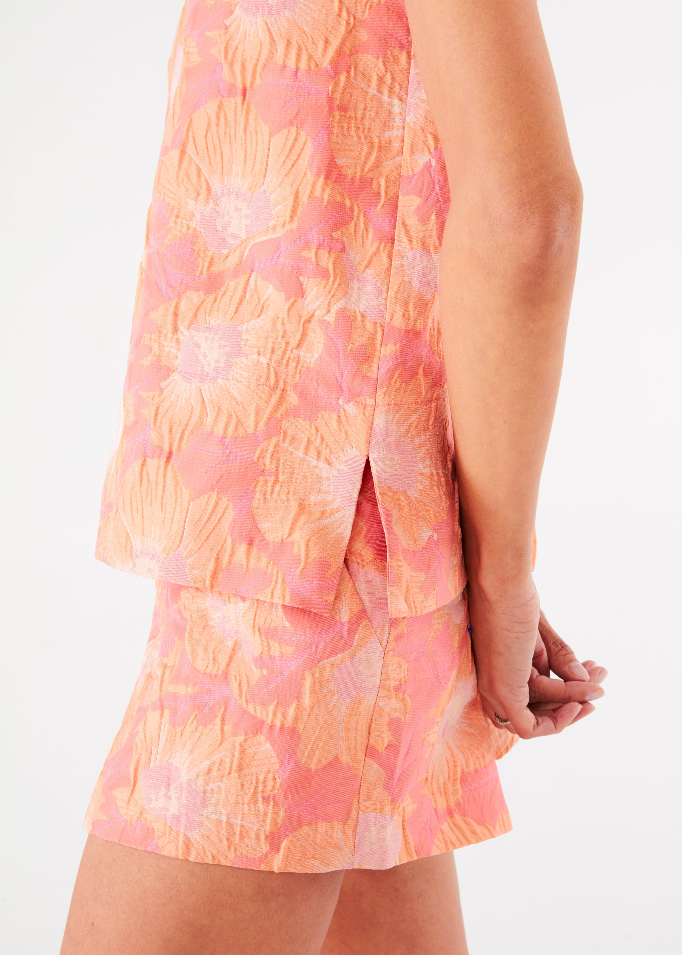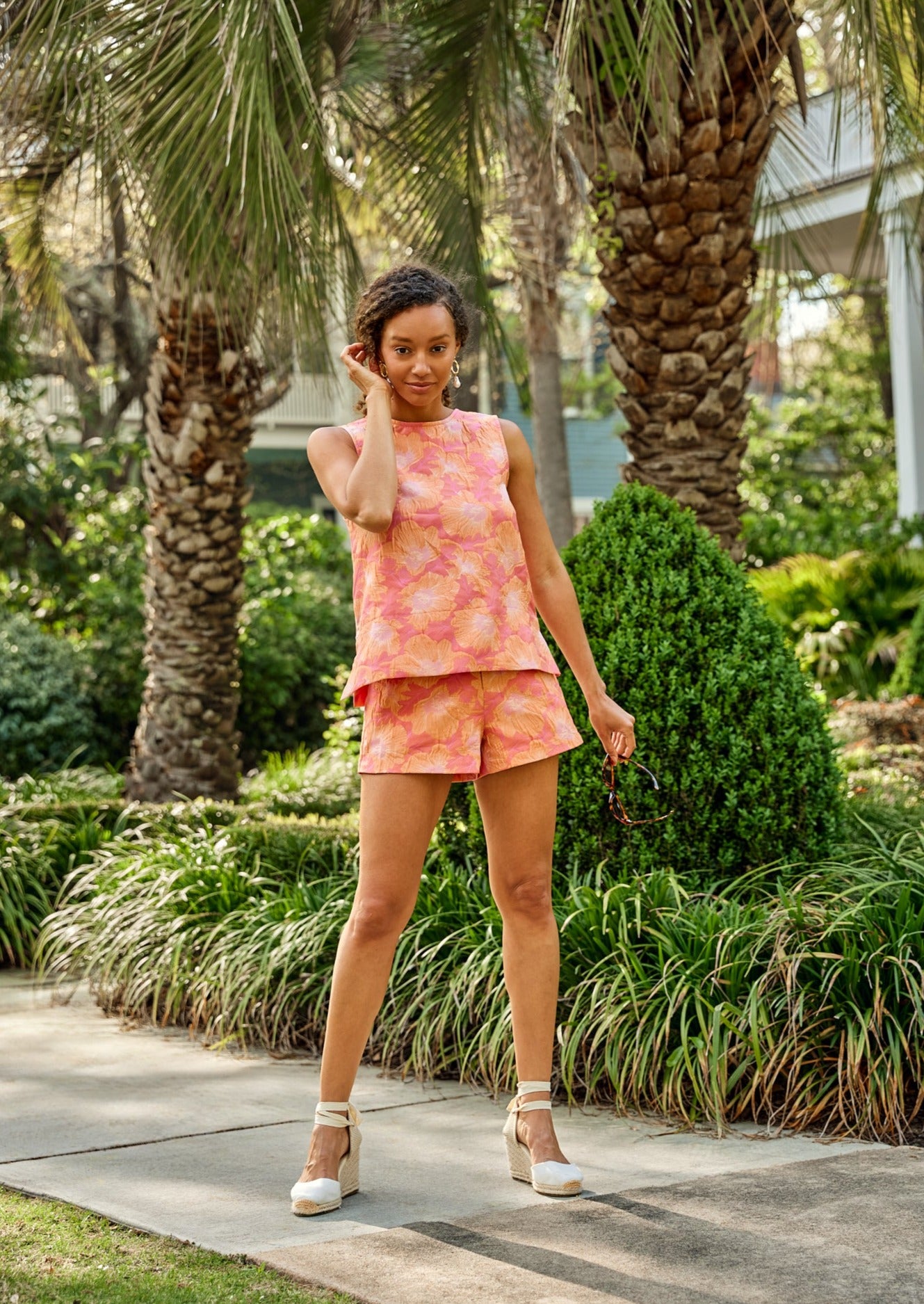 The Zoe Top is the elevated summer statement top. This sleeveless beauty is crafted of a luxe tropical jacquard, making it an outfit on its own. For a full look, pair it with the matching Penny shorts to elevate the top for evening out on vacation or for a daytime summer event.